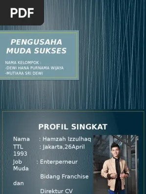 Pendahuluan ( latar belakang pengusaha ). Setiani hapsari (21080111130080) profil singkat nama : Pemuda kelahiran jakarta, 26 april 1993 ini adalah seorang direktur utama pt hamasa indonesia. Biografi hamzah izzulhaq entrepreneur berusia 18 tahun ini tidak ingat secara pasti sejak kapan ia mulai berdagang. Di usianya yang baru menginjak 24 tahun, .
